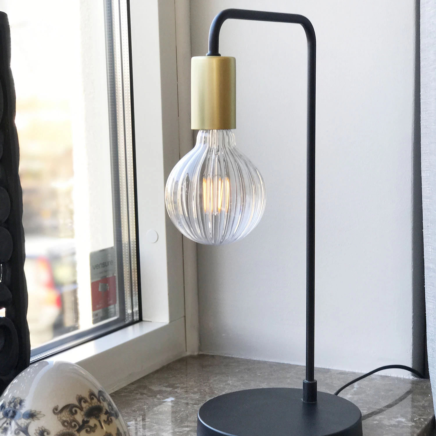 Fondi is a simple and sleek table lamp in black metal. The lamp fixture in unpolished brass curves away from the straight stand and directs the light downwards. The floor lamp is 45 cm high and you add a suitably sized light source yourself.