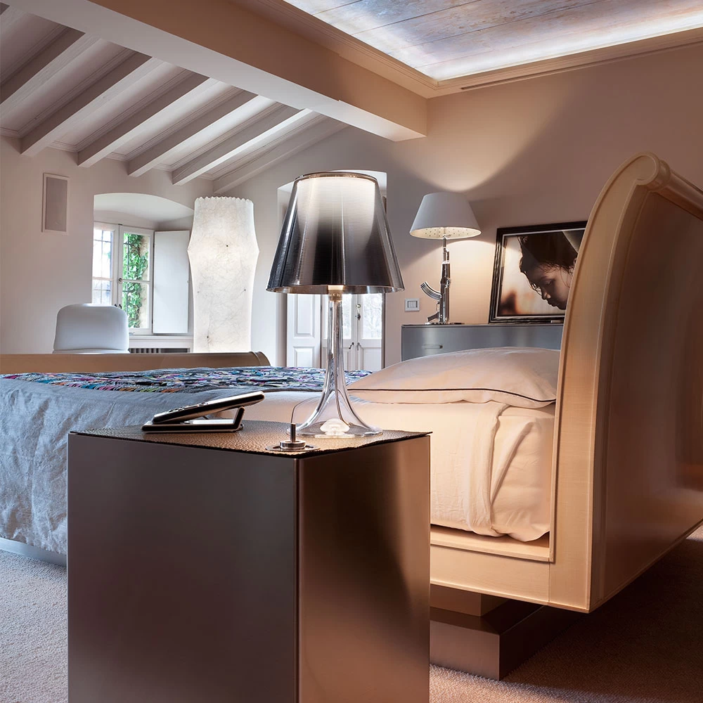 Miss K Table Lamp designed by Philippe Starck for Flos. A modern table lamp in a classic design. The lamp changes the shape depending on whether it is on or off. When it’s extinguished its transparent screen gives a sleek metallic shade. Miss K provides a comfortable and diffuse light and is more than a regular table lamp. Dimmable and transparent cord.
