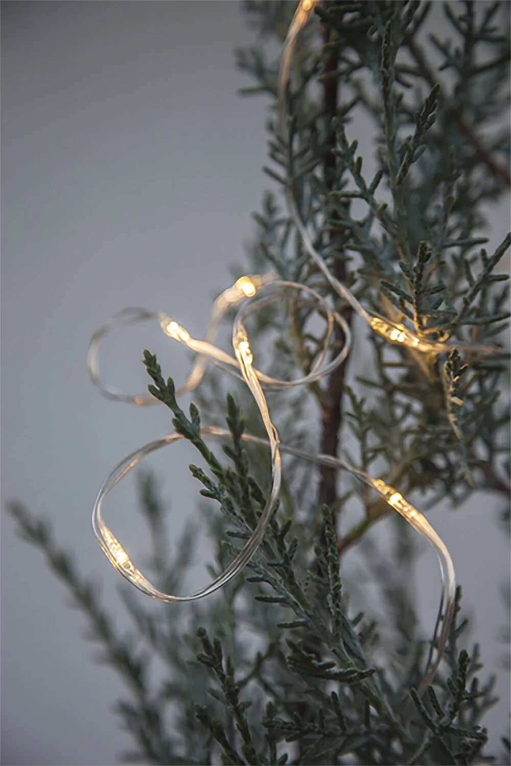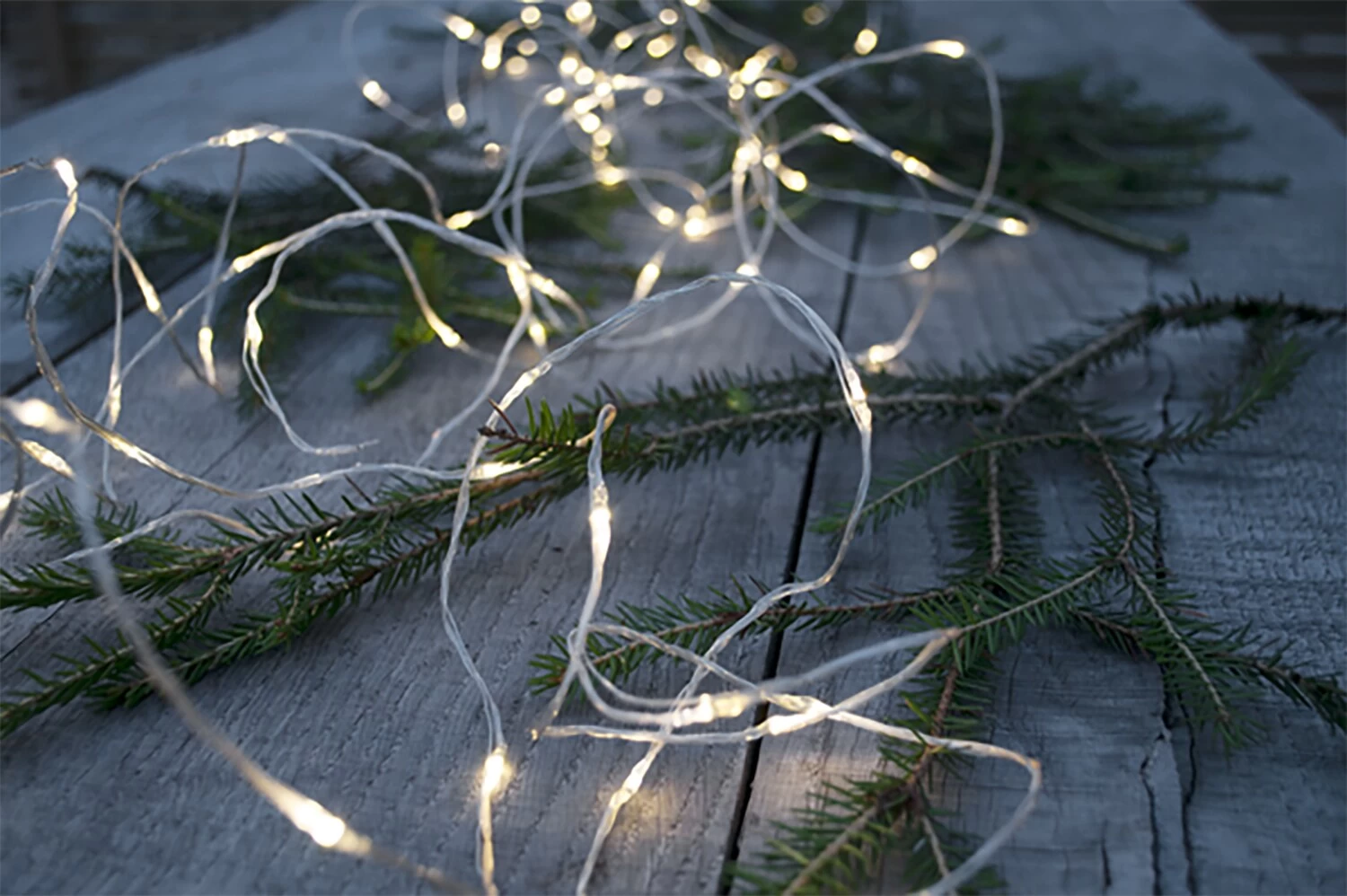 Light Strand Dew Drop for outdoor use from Star Trading. A silver colored loop with warm white LED Dew drops light sources. A perfect alternative to decorate with in flower pots or on the patio.