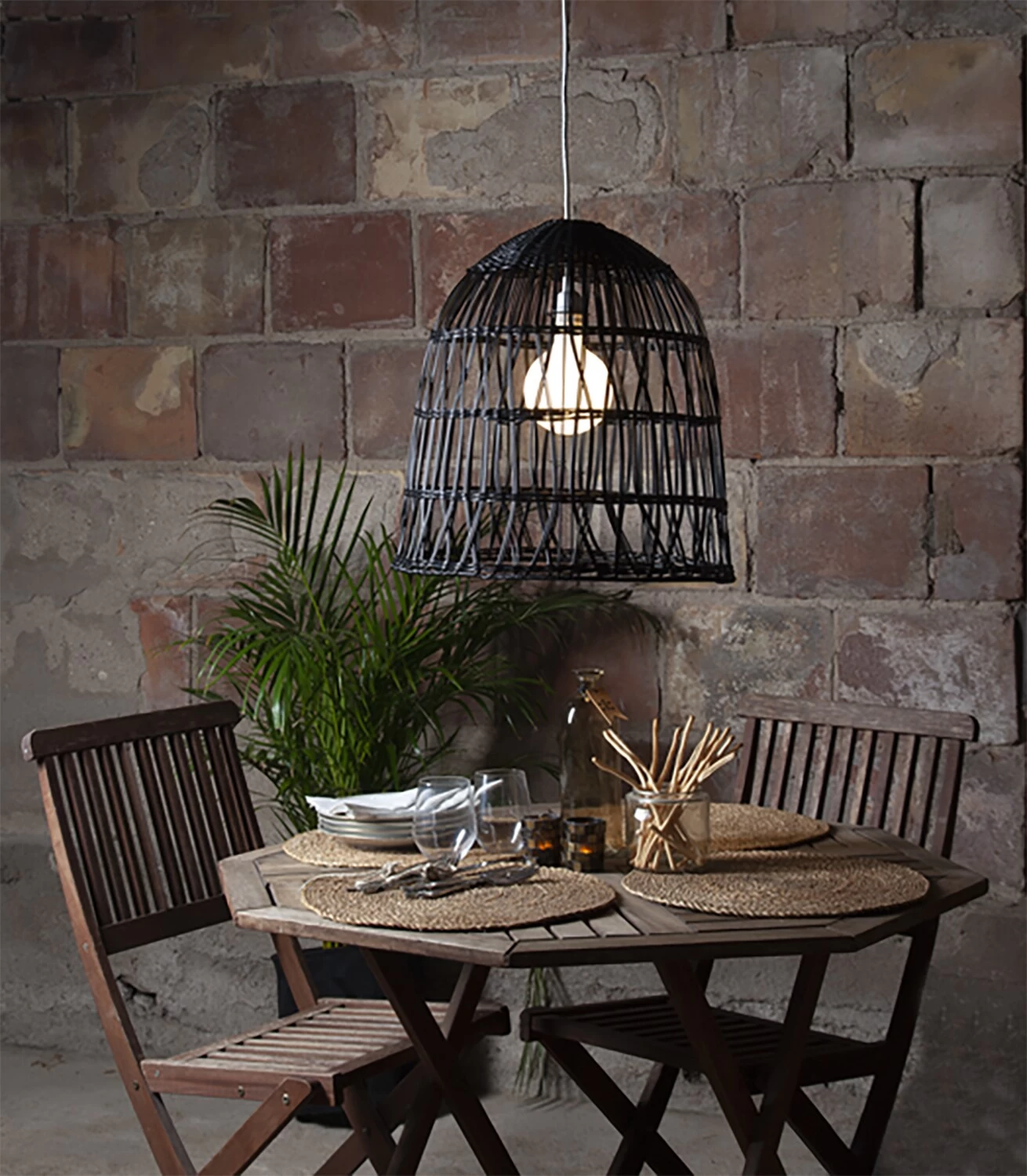Modern lampshade in art rattan for outdoor use. With braided structure, it gives an exciting light play and creates a lovely atmosphere. Ideally used with E27 socket.