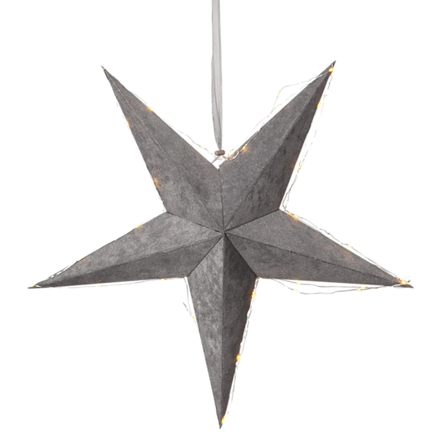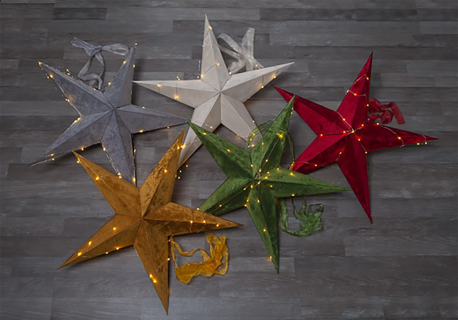 Beautiful velvet star with associated Dew Drop light trail from Star Trading. A flexible star that can either be hung in a window or placed against a wall on a sideboard. A cozy interior decoration for the home that gives a lovely Christmas feeling. The loop gives a warm white and comfortable glow. The star is equipped with a timer that means you turn it on once, and then it glows for six hours and then lights up the same time the next day again. Powered with AA-batteries purchased separately.