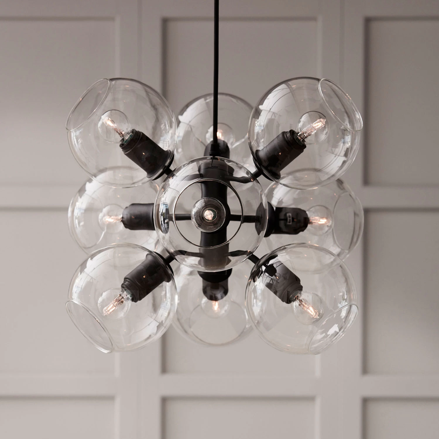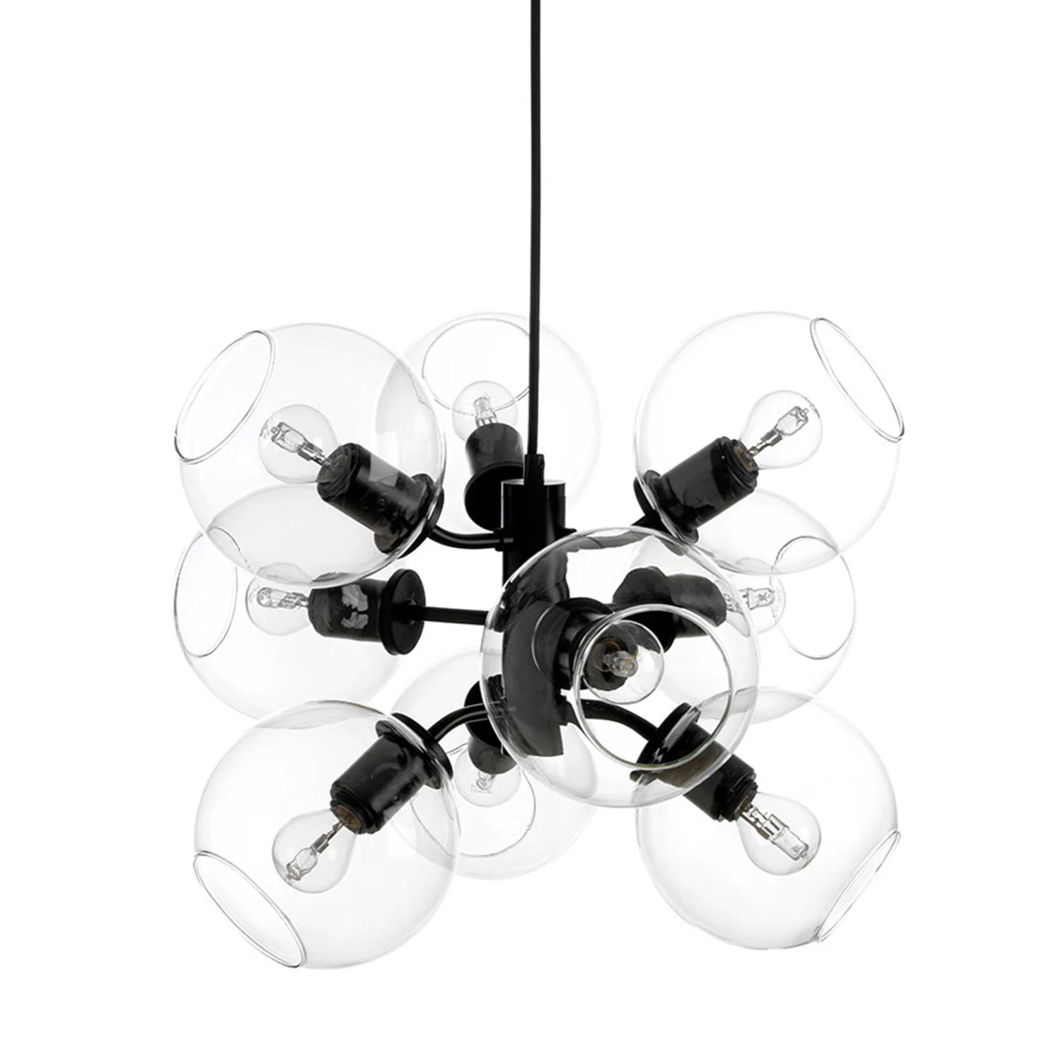 Tage 50 plafondlamp van Co Bankeryd. Een unieke kroonluchterachtige lamp in moderne stijl. Dit is een uitstekende lamp om boven de eettafel te hangen. Met negen lampen en elke glazen koepel als lampenkap geeft Tage een elegante indruk. Het is een grote lamp die ruimte nodig heeft, maar pas echt effectief wordt als je de juiste plek vindt om hem op te hangen.