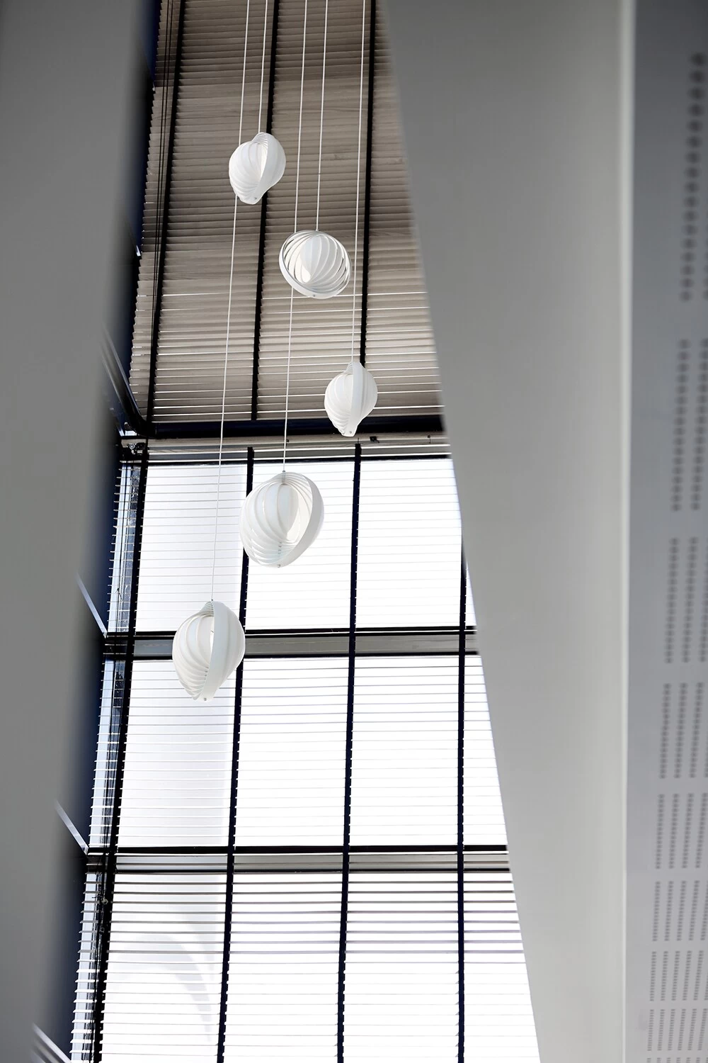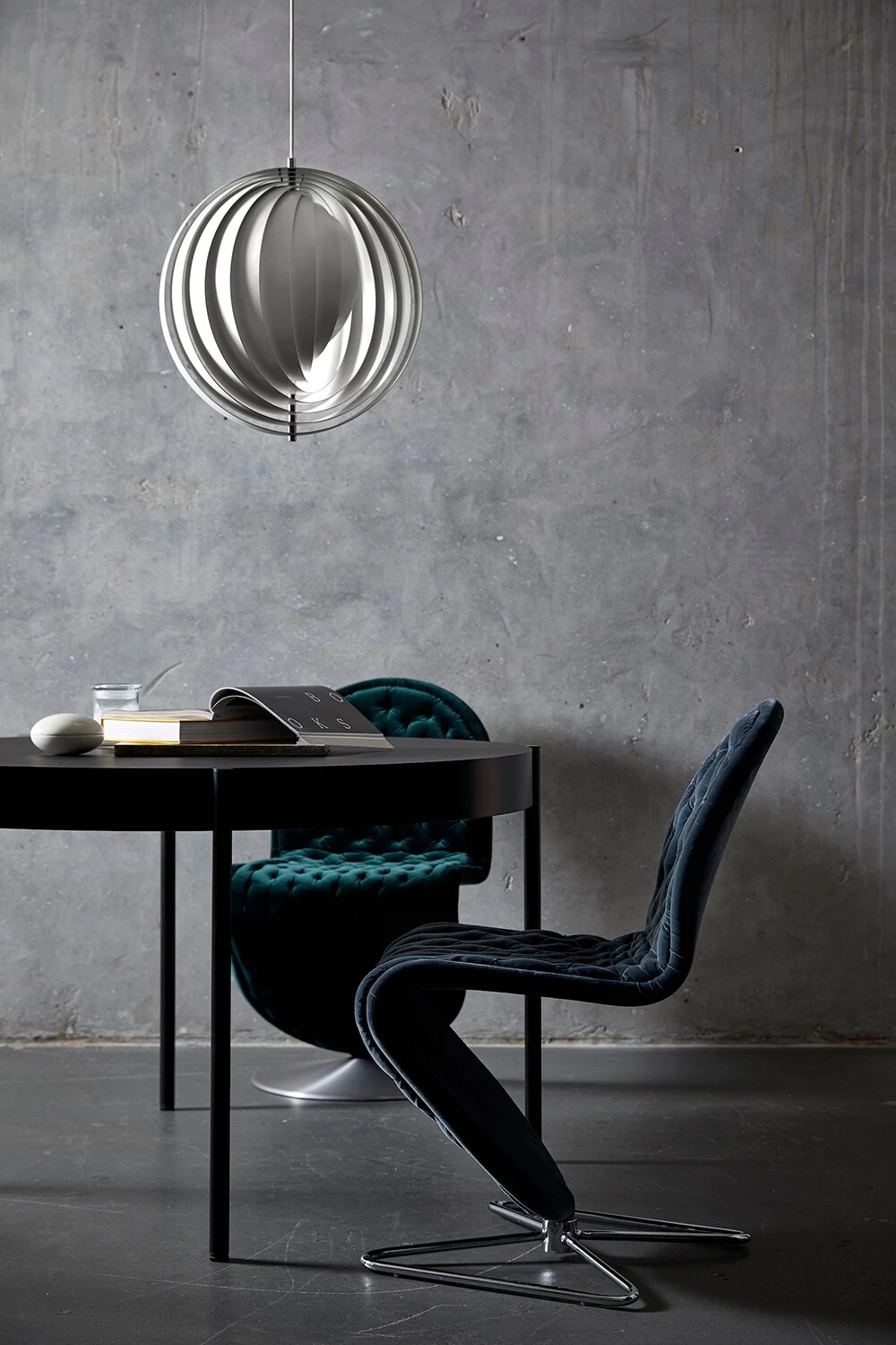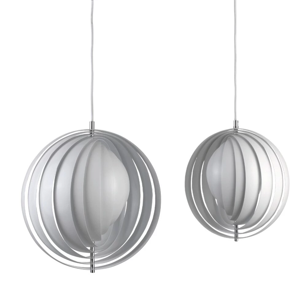 Moon is a phenomenal pendant lamp with a three-dimensional and spherical design by Verner Panton for Verpan. The lampshade consists of vertical lamellae made of white lacquered metal, which makes it possible for individual regulation of the light.