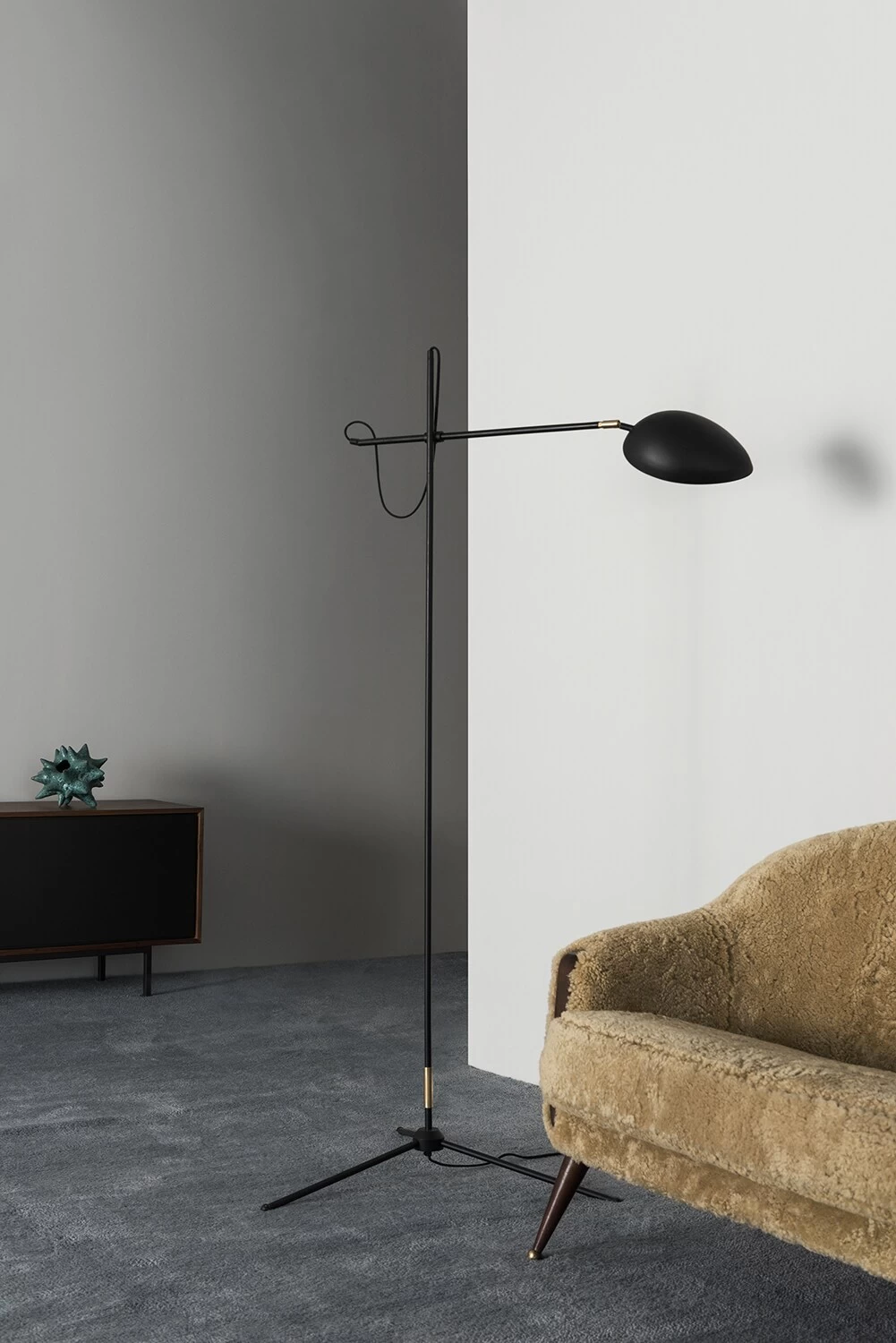 The unique collaboration between Watt & Veke and Hanna Wessman have resulted in five modern lighting models that belong to the Spoon series. This retro-look floor lamp is made of black-lacquered metal with a matte finish and stylish brass details that fit perfectly next to the sofa as an atmospheric reading lamp. The floor lamp has an adjustable arm and an adjustable shade with a matte white inside that helps the light to be reflected in the best way to provide functional lighting in your home. Use the built-in dimmer to dampen or increase brightness to your needs.
